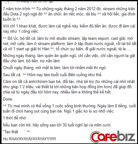 "Em viết status để nhắc nhở bản thân không còn làm việc điên cuồng vì chữ streamer. Em đã đạt được mục đích ban đầu theo nó. Là góp phần biến nó thành công việc, có môi trường riêng và có giá trị riêng. Cũng tự nhắc nhở đã có một tuổi trẻ tưng bừng. Dám làm dám học hỏi va chạm. Làm hết mình chơi mất xác về ngủ dậy lại quay cuồng. Tới lúc đã thấy đủ với đam mê. Với công việc. Muốn sống một cuộc sống bình thường", PewPew trải lòng trên Facebook.